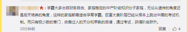 有网友在微博下面评论说:学霸大多出自财务自由,家庭稳定的知识分子家庭,只有极少数的寒门,依靠过人的天分通过考试获得阶级跃升。