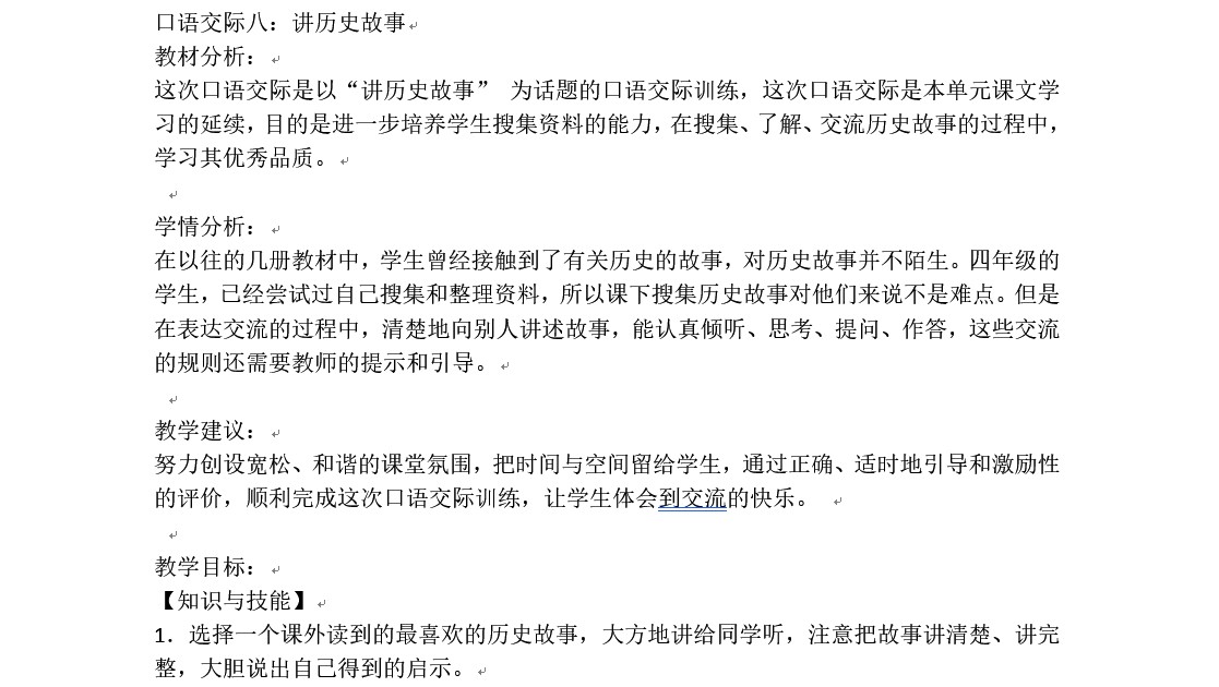 2、口语交际。 (1)能认真听别人讲话,听懂别人说的一段话和一件简单的事,能转述其基本内容,能讲述课文所写的故事。 (2)能在看图或观察事物后,用普通话说几句意思完整、连贯的话。 (3)能就所听所读的内容,用普通话回答问题,做到语句完整,意思连贯。 (4)能当众说话,愿意与别人进行口语交际,做到语句比较通顺,态度大方,有礼貌。 (5)讨论问题能主动发言,说清楚自己的意思。 教学重点:能在看图或观察事物后,用普通话说几句意思完整、连贯的话。能就所听所读的内容,用普通话回答问题,做到语句完整,意思连贯