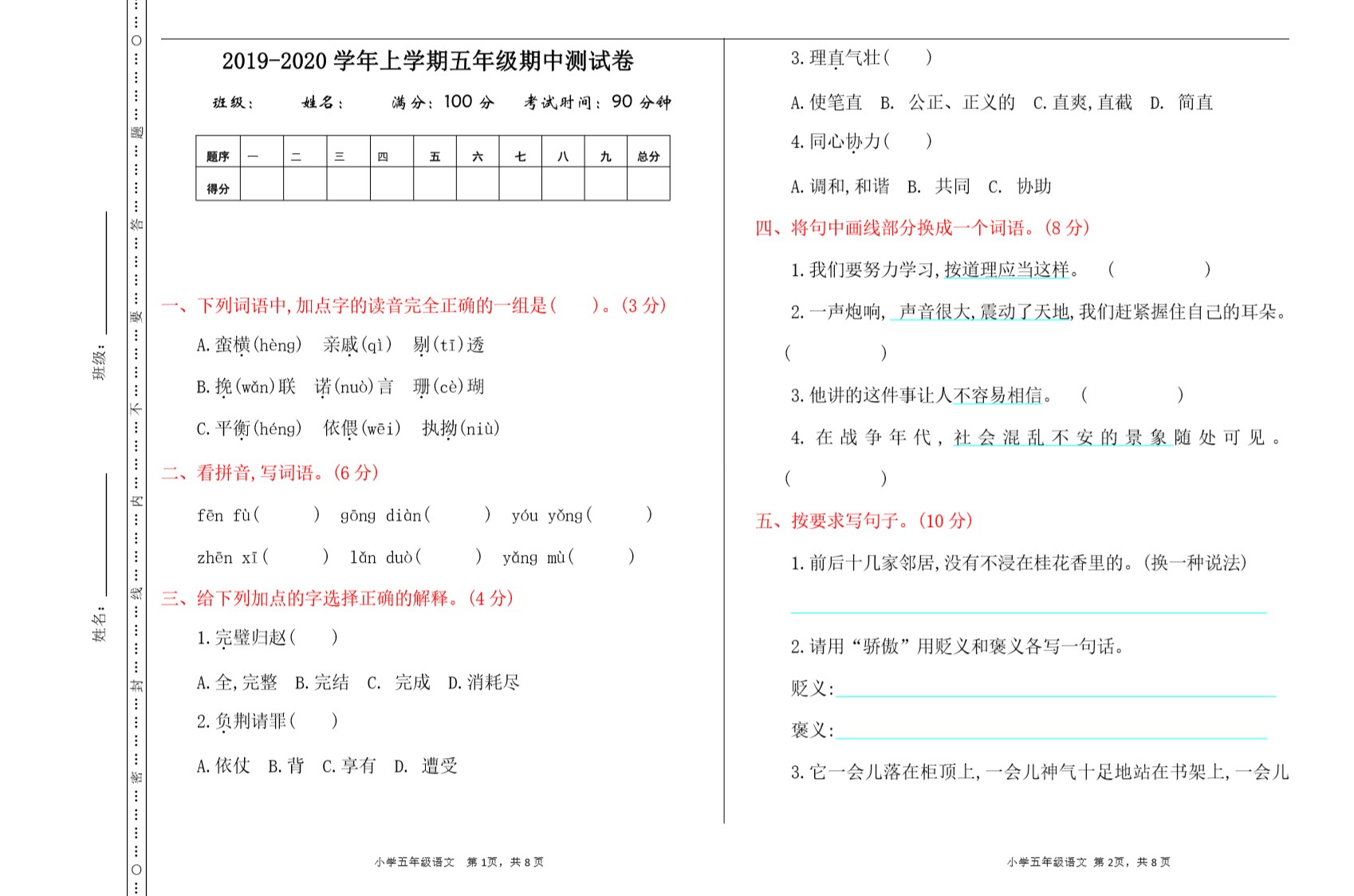 这一份无广告的期中试卷,五年级的老师一定要收好~~下方有打印版的下载地址,当然你也可以复制需要的部分到你的试卷中。