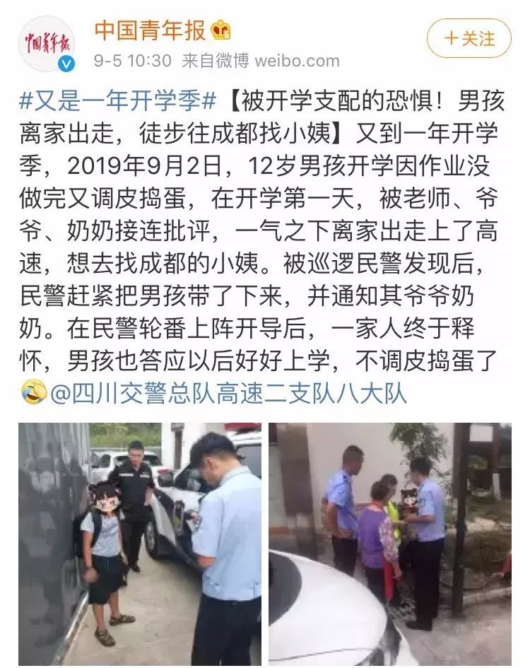 无独有偶,一个12岁男孩也因作业没做完又调皮捣蛋,在开学第一天,被老师、爷爷、奶奶接连批评,一气之下离家出走上了高速,去找成都的小姨。