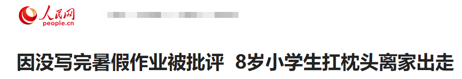 前段时间看到一则新闻:有个8岁小学生,因为没写完暑假作业,被父母批评后,拎着衣服和枕头离家出走。