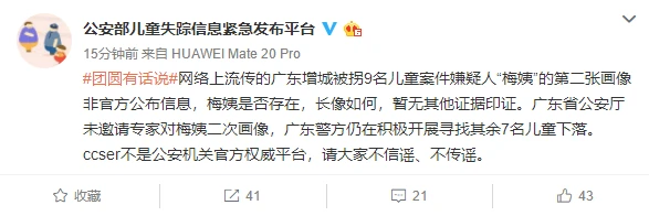 网络上流传的广东增城被拐9名儿童案件嫌疑人“梅姨”的第二张画像非官方公布信息,“梅姨”是否存在、长相如何,暂无其他证据印证。11月13日,警方通报已找回2名被拐儿童。目前,广东省公安厅未邀请专家对“梅姨”二次画像,广东警方仍在积极寻找其余7名儿童下落。
