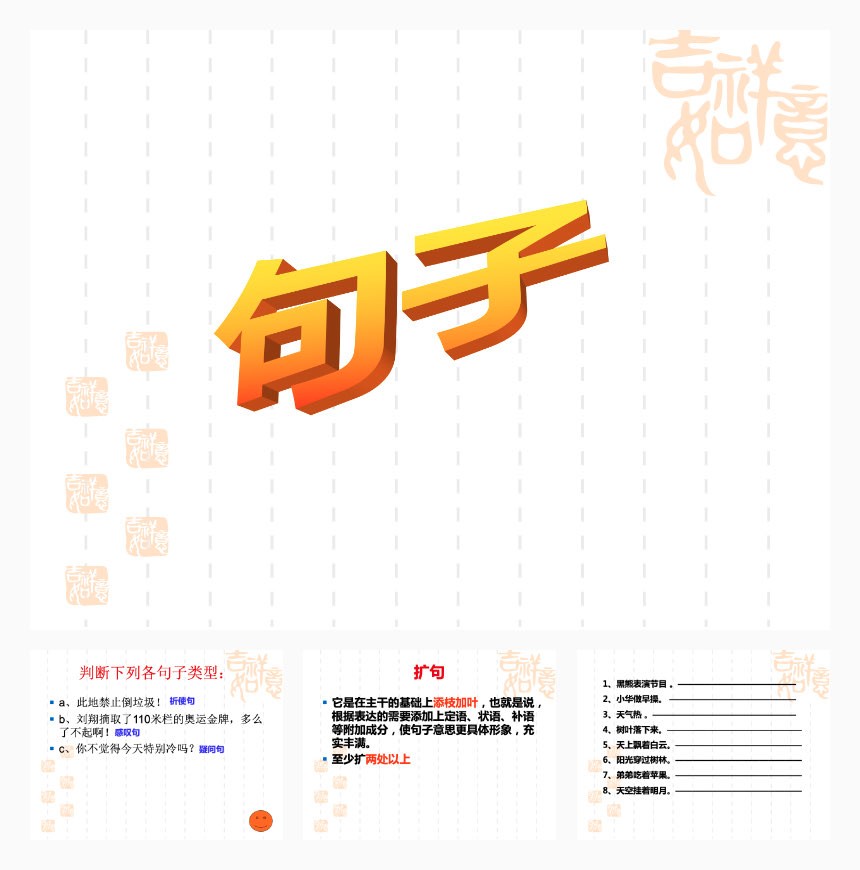 句子的学习是一个难题,本PPT里面包括了:句子分类、扩句和缩句、句式转换、修改病句。
