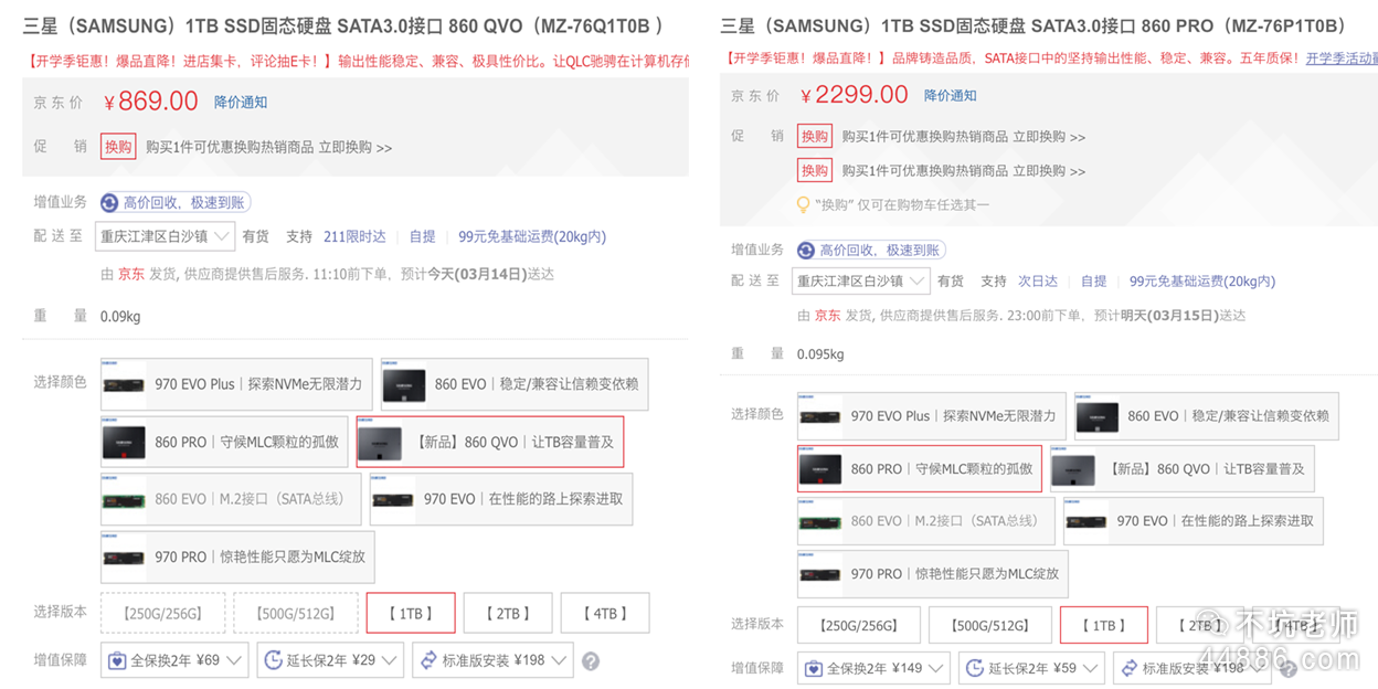 网上买电脑,在配置清单里面,很多店只告诉你容量的大小,而不告诉你某个配件的具体型号。千万别以为只要容量相同,价格就差不多,看下图,左右两边都是三星的1T固态硬盘,但价格差别却大得惊人!