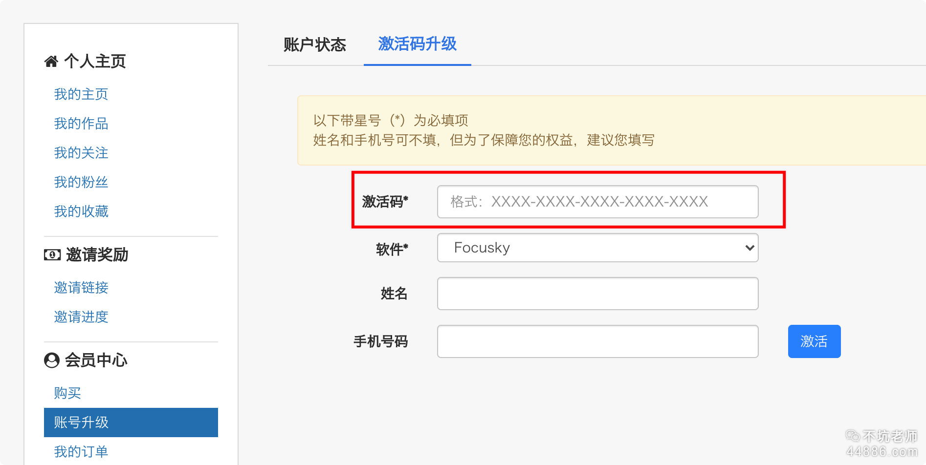 3.在“账号升级”-“激活码升级”中填入上方激活码即可