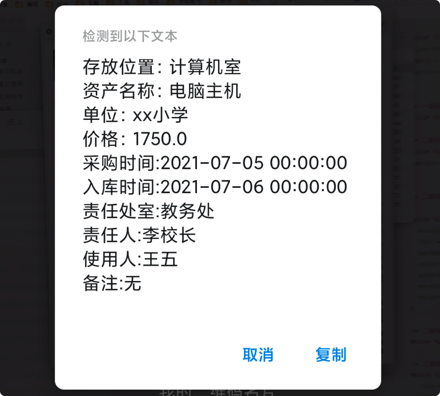 tmp = "存放位置:%s\n资产名称:%s\n单位:%s\n价格:%s\n采购时间:%s\n入库时间:%s\n责任处室:%s\n责任人:%s\n使用人:%s\n备注:%s\n"