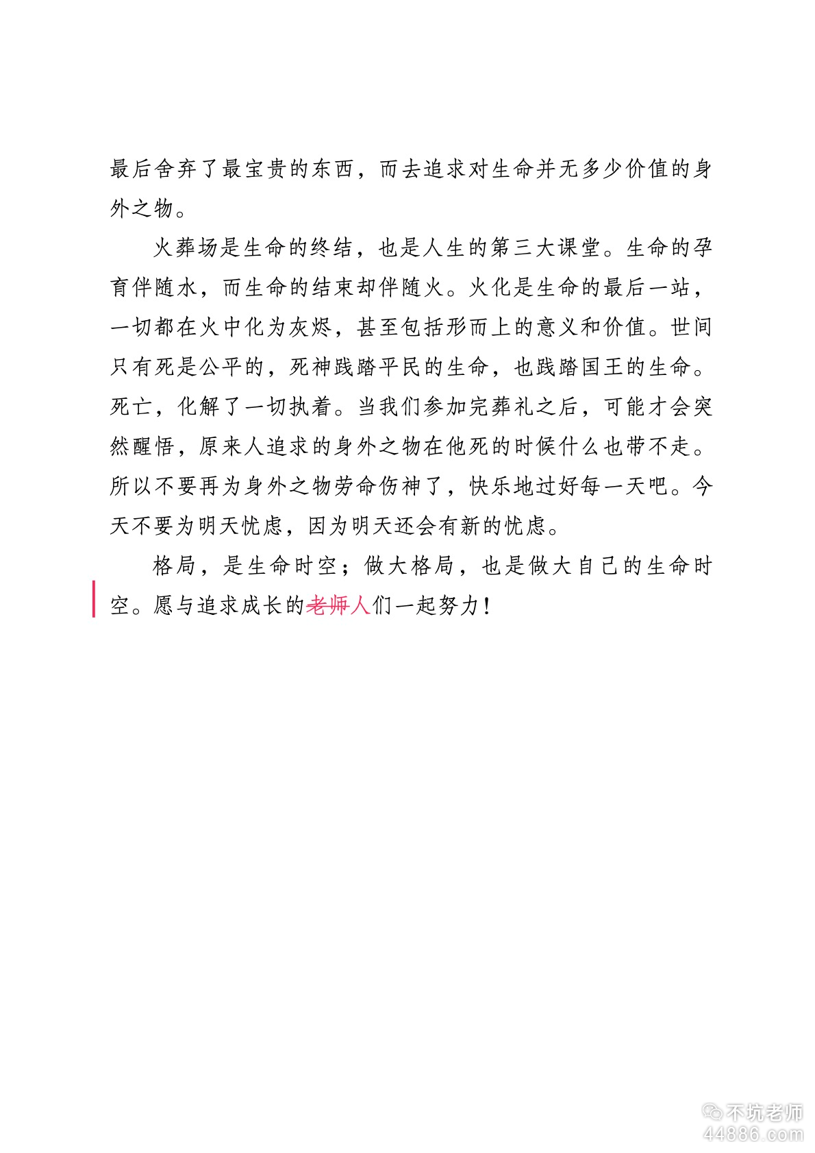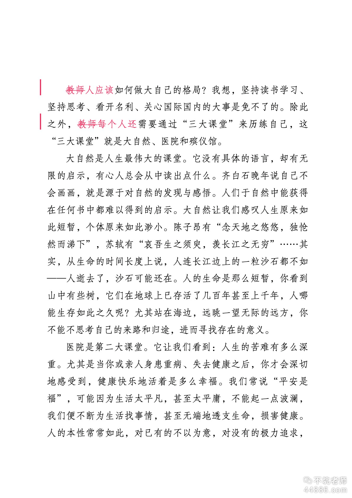 文章的大致内容是:许多教师只关心职业内部的事情,活在自己的职业身份之中,不少教师对一些重要事情的判断,价值水准很低。教师需要通过大自然、医院和殡仪馆这“三大课堂”来提升自己的格局。