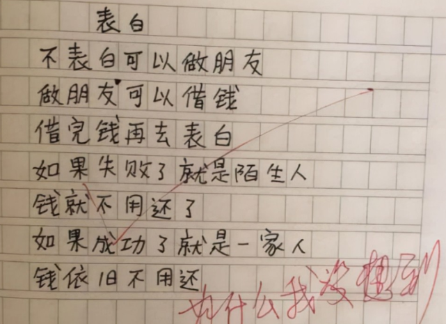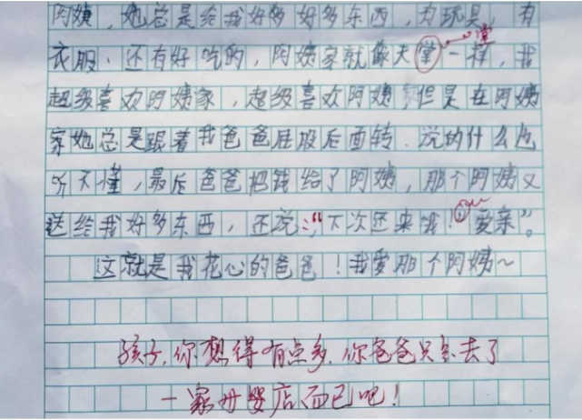 这个小学生的作文,描写自己的爸爸,真的叫人笑出了眼泪,作文的第一句就表达了自己的真实感受“我不喜欢爸爸,因为我的爸爸太花心”,直到把整篇作文《花心的爸爸》读完后,才明白爸爸只是拿着钱去店里,给孩子买衣服和玩具,售货的阿姨一直跟在后面,最后把钱给了阿姨,让这位小学生误以为爸爸很花心,还觉得阿姨人很好送给他很多礼物,真的是童言无忌,想象力丰富。