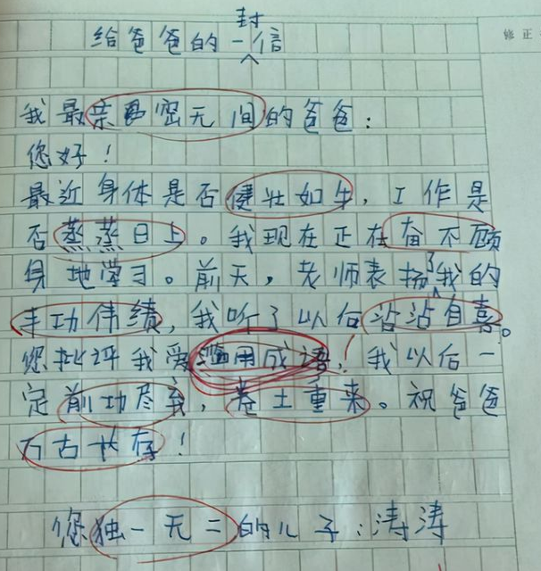 父亲的角色是非常高大上的,这位小学生的作文是《给爸爸的一封信》,虽然能够运用很多的成语,但是却没有弄懂成语的含义,整篇作文都被老师勾画了出来,看来这位小学生要好好学习成语了,不过虽然错误比较多,但是却表达了对父亲的爱意。