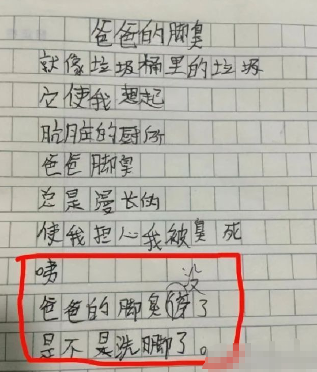 在小学生们所写的作文当中,最简单的是要从人物写起,很多小学生会描写自己的爸爸,这位小学生的作文是《爸爸的脚臭》,将爸爸的脚臭描绘的淋漓尽致,还采用了比喻等修辞方法,老师看完忍不住笑,这位爸爸应该尴尬的不好意思去学校接孩子了,也只有小学生,能够这样的表现自己的内心感受吧。
