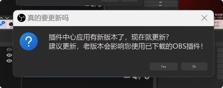这款插件中心制作还挺完善的,配备了“自动更新”功能,如果有新版本,启动obs时就会提醒你。