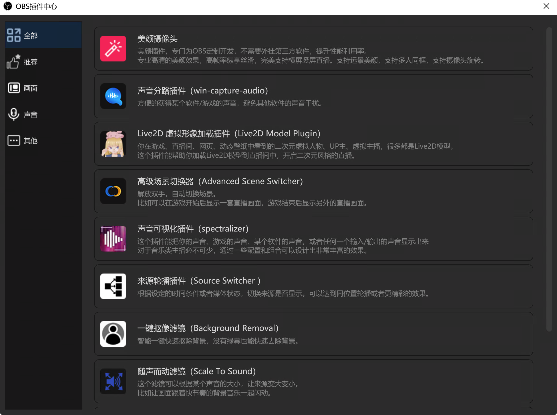 今天,给大家分享一款obs美颜插件,准确来讲,给大家分享的是一个插件中心,这个插件中心里面有一个强大的美颜插件!