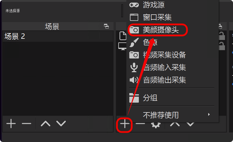这一步最关键。要用“美颜摄像头”这一来源,代替原本的“视频采集设备”!