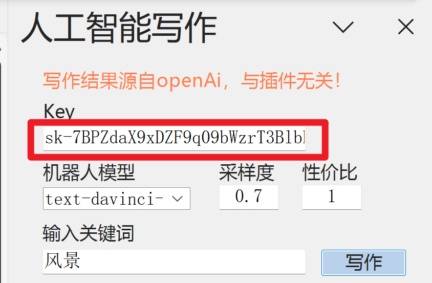 请大家自行在openai官网申请一个自己key,填入插件里面,插件会记忆,下次不用再填。
