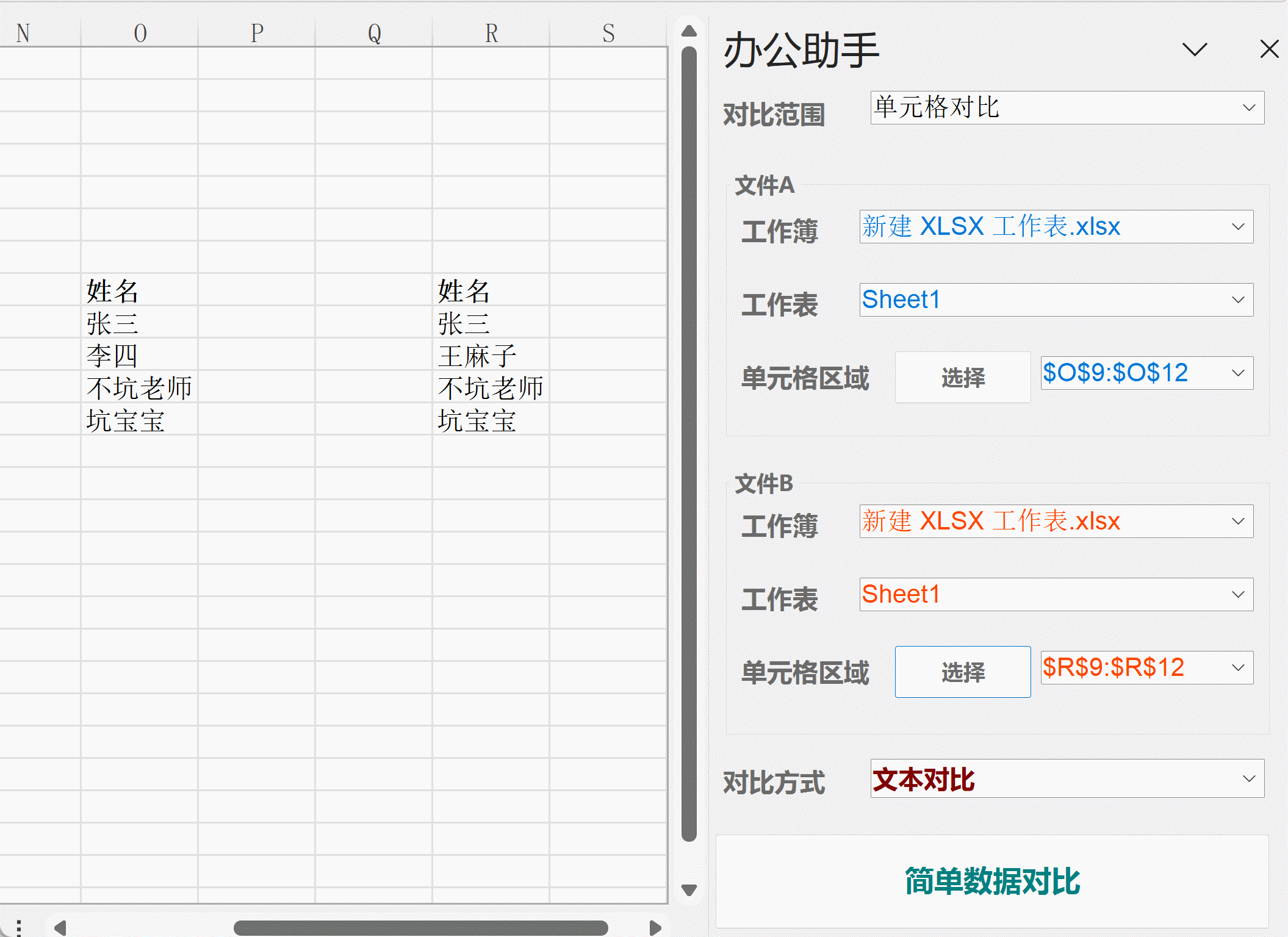 新生报名册的对比、体测数据表的对比,可能是大伙用得比较多的。插件的“数据对比”功能或许可以帮上大忙。
