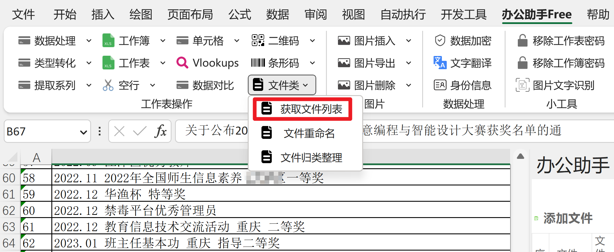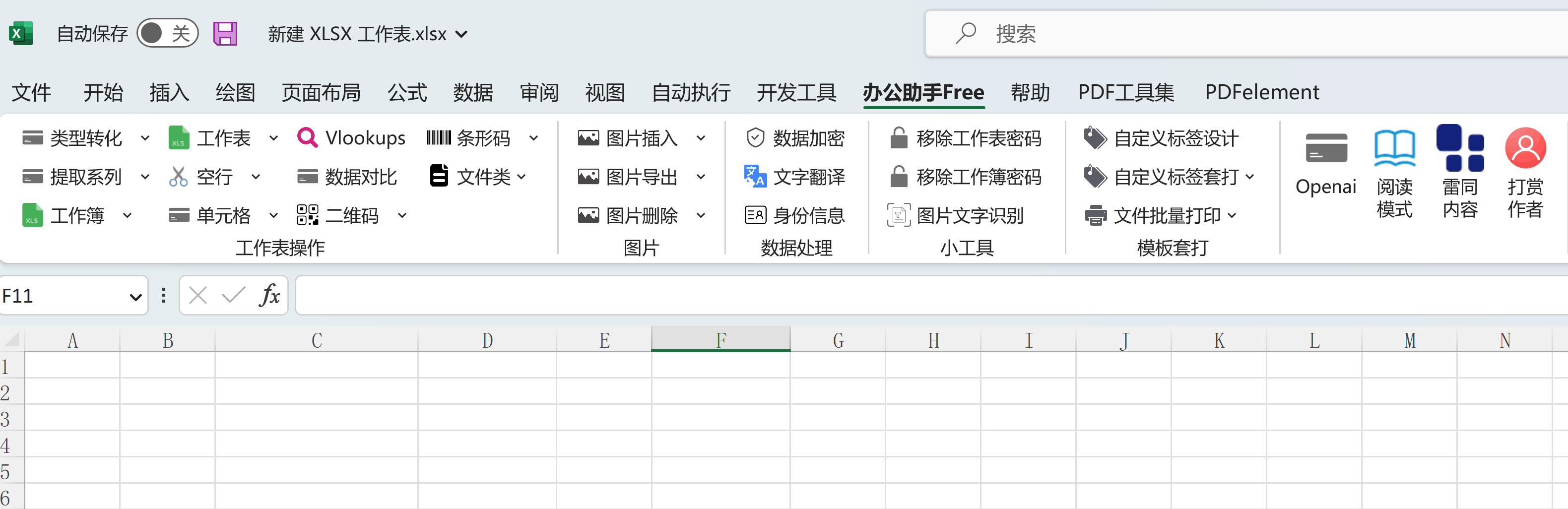 安装完成后,Excel中就会多一个“办公助手Free”功能卡,Office和WPS中都会显示。