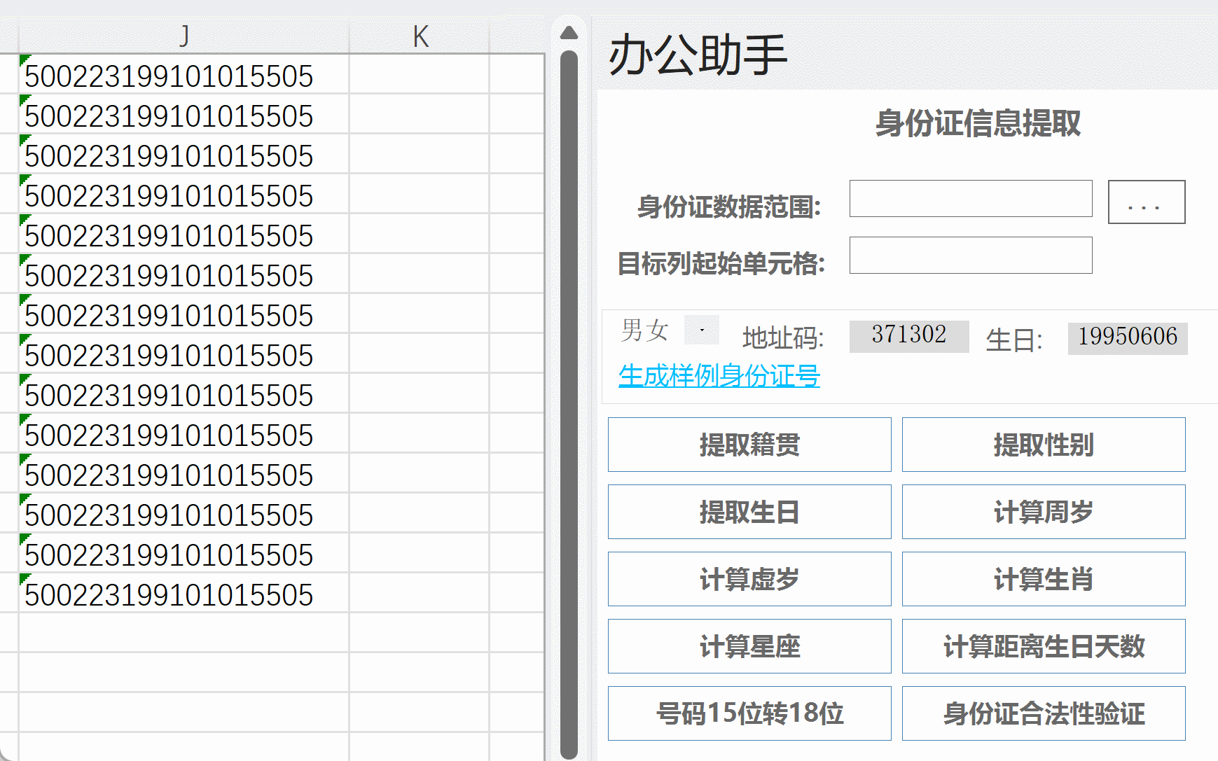 这个过程会覆盖原来身份证的列,真正使用前建议把身份证列复制一份,以免身份证列被覆盖。