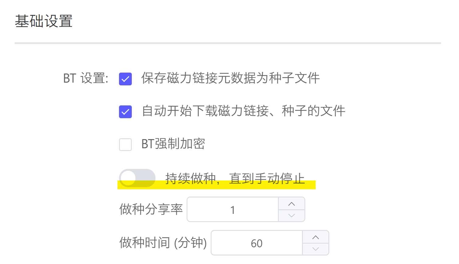 你可以在“基础设置”的这儿来控制是否“做种”。