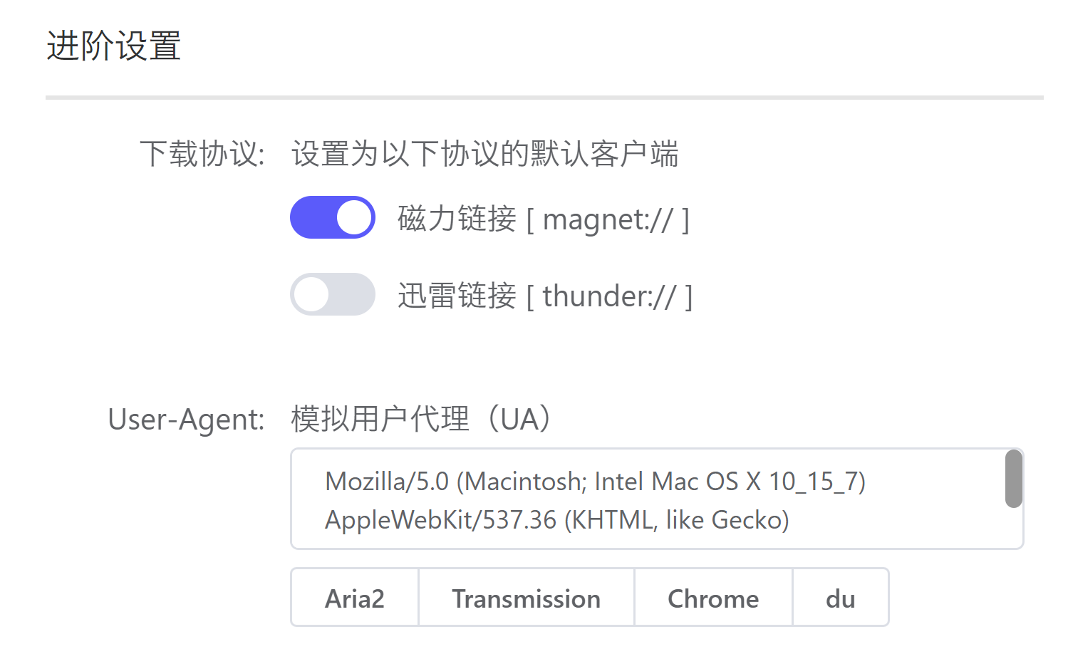 下面的端口和UA,建议不修改。如果你需要下载迅雷专属链接,那就把迅雷链接的开关给打开。