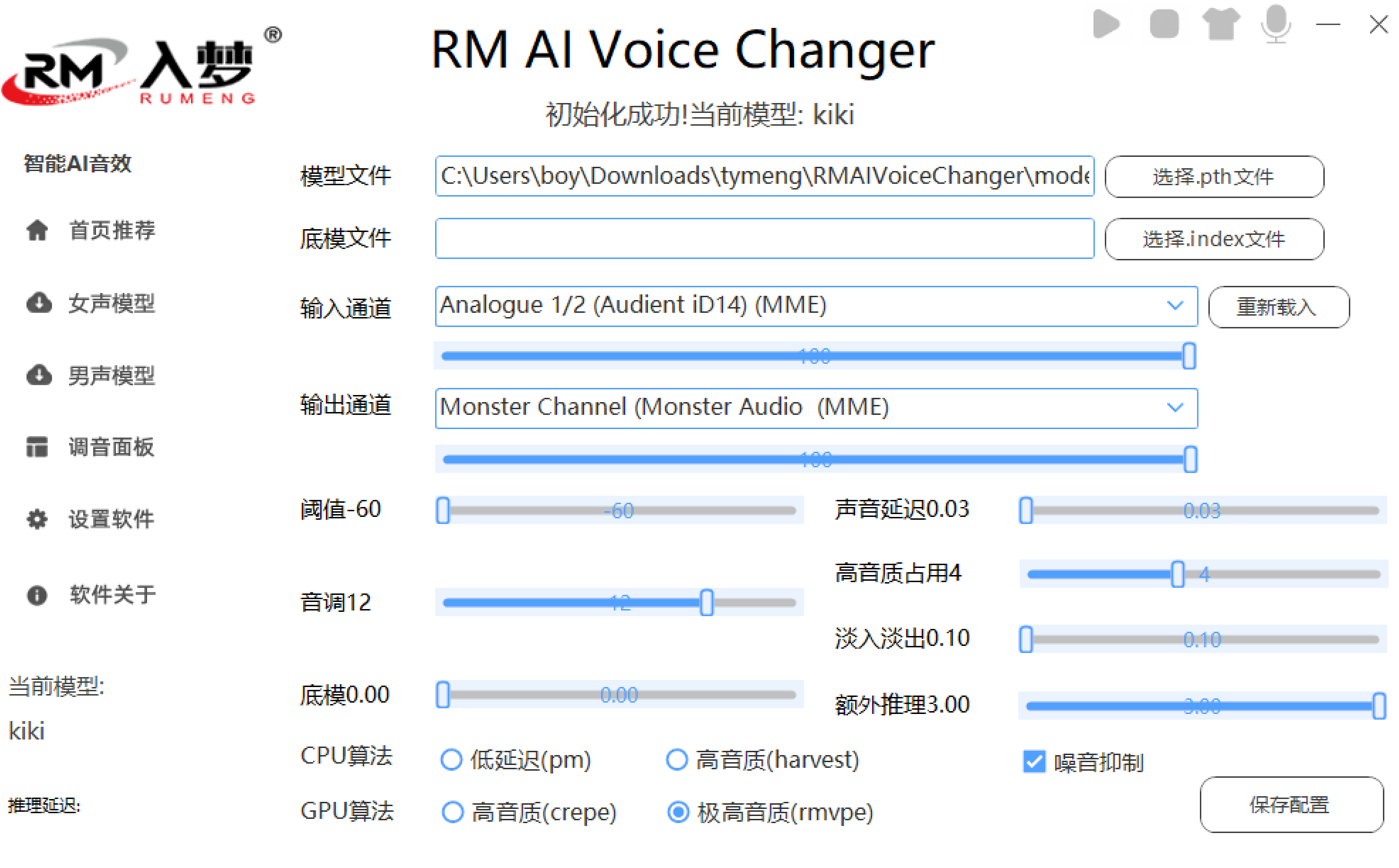 在输出通道处,选择“入梦扬声器”;在以后任何你想要拾取变音后的声音的时候,音频输入选择“入梦麦克风”。