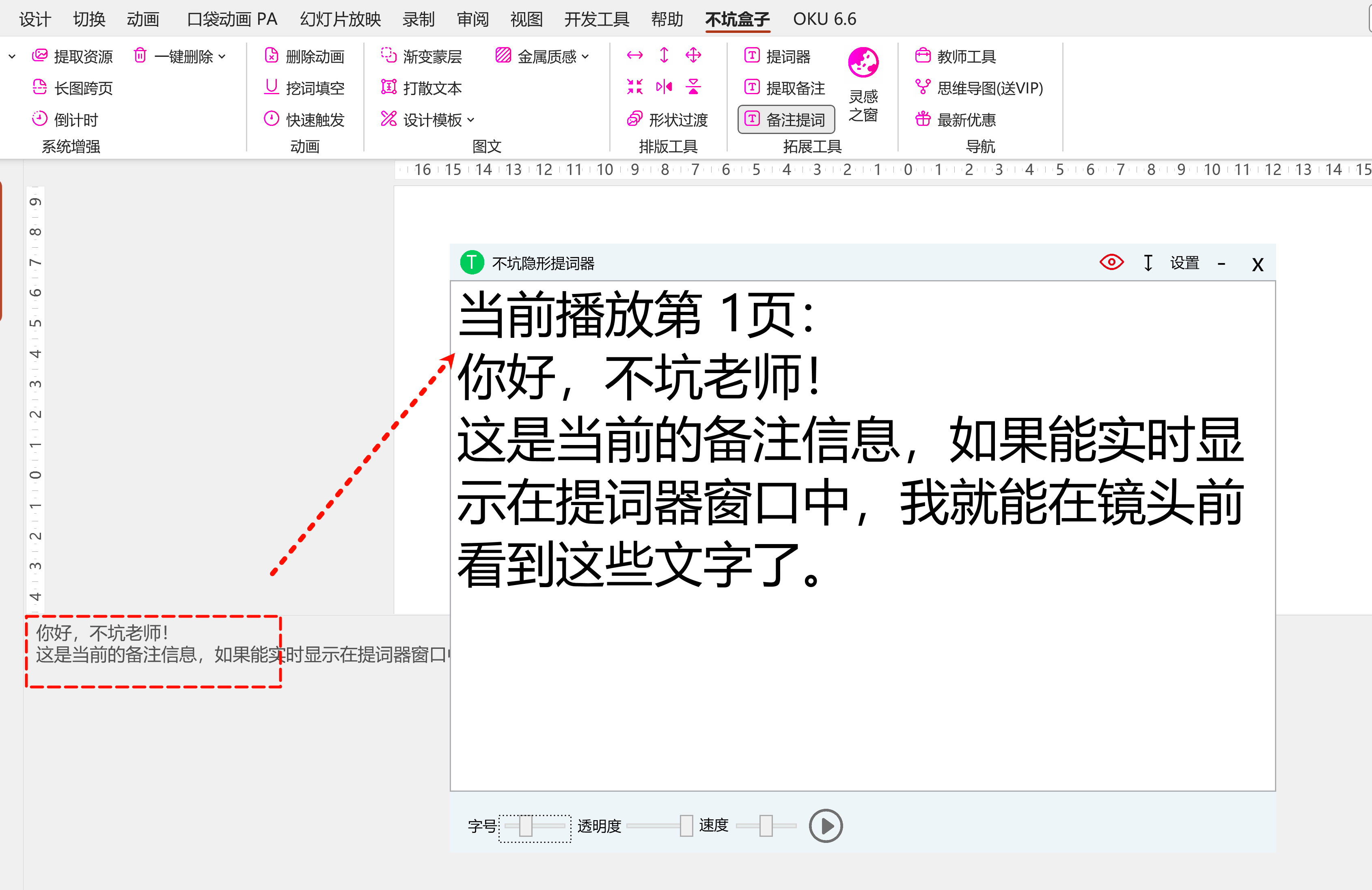 我一直在不坑盒子里面镶嵌了“不坑提词器”,最初的时候可以一键把Word中的文本导入到提词器中;如今可以直接把PPT中的备注显示在提词器中了。