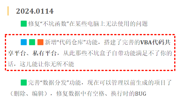 不坑盒子在2024.0114版本上线了“代码仓库”这个功能,这个功能为大家在Word、PPT、Excel中搭建了VBA私有库和共享库,所有人都可以在里面存放自己常用的VBA代码,也可以一键免费使用别人共享的代码;是一个非常强大的VBA生态平台。