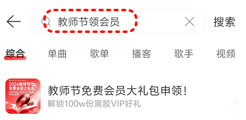 在网易云音乐手机APP中搜索“教师节”,即可进入领取大礼包界面。