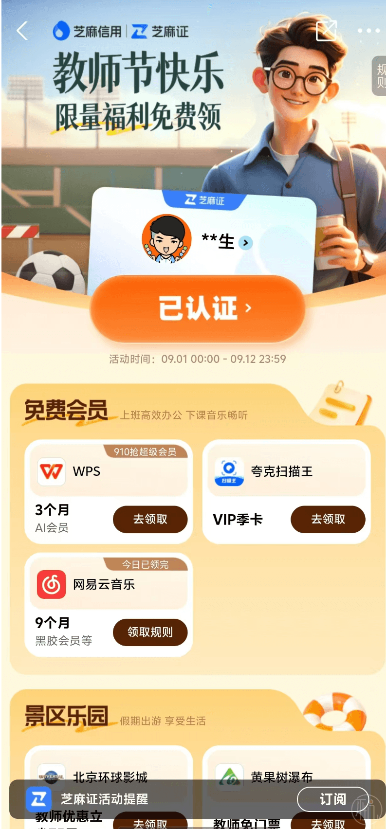 在支付宝的芝麻信用中进行教师认证后,里面还有其他很多优惠,比如:夸克3个月扫描会员。还有很多景区的优惠,大家可以在里面找找自己感兴趣的。