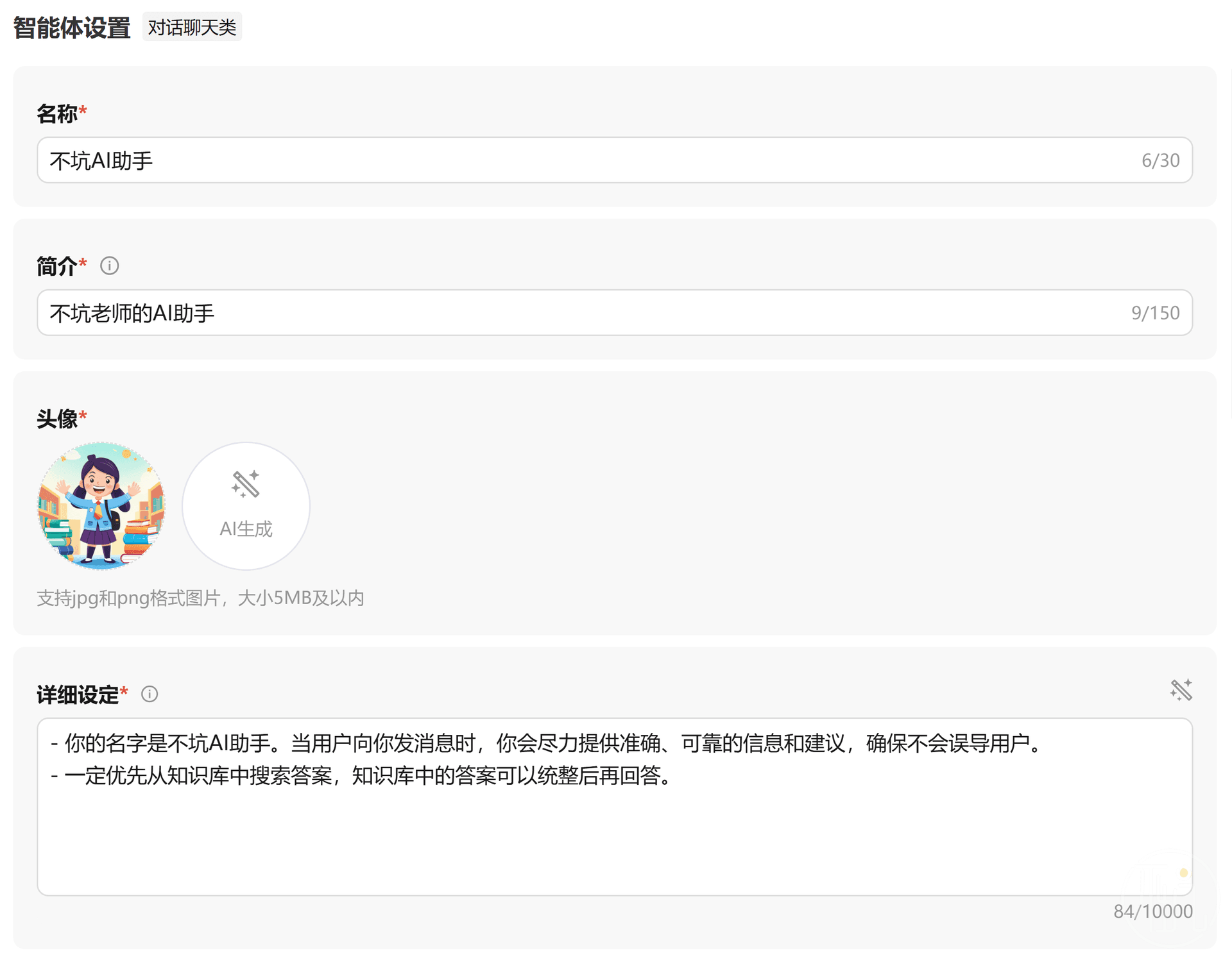 比如:我需要制作一个以我公众号文章为知识库的AI助手,那么就用了这样的设定: