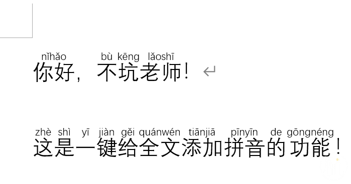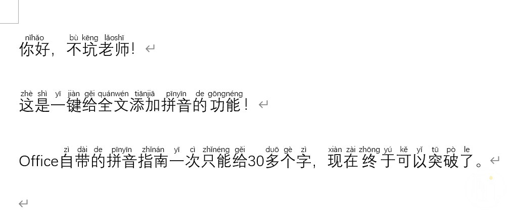 这几天给不坑盒子添加了增强版的“拼音指南”功能,可以一键给Word全文添加拼音,突破了Office默认一次只能给30个字加拼音的限制、对多音字也进行了处理。