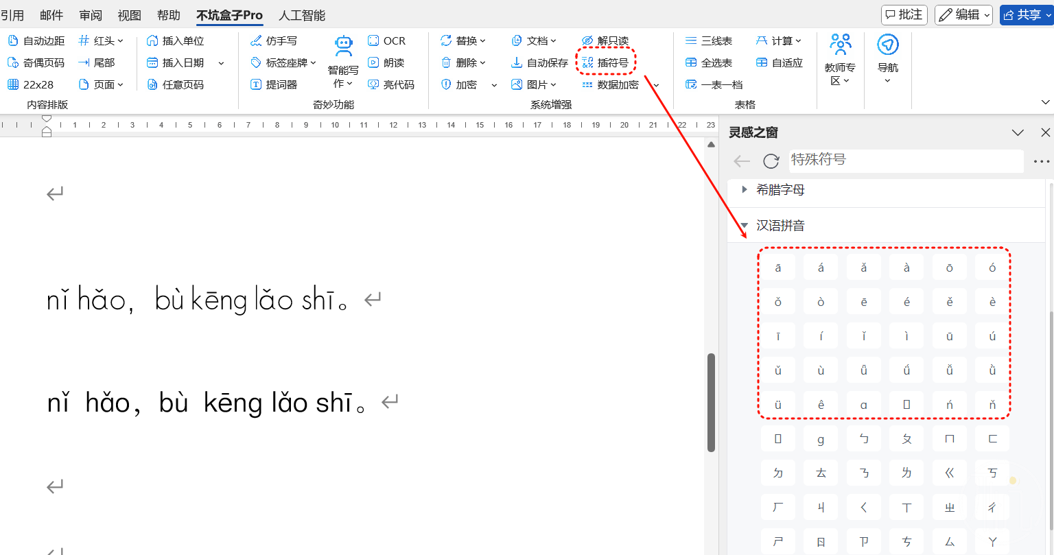你也可以利用不坑盒子中的“插符号”功能来快速在光标处打上带声调的字母: