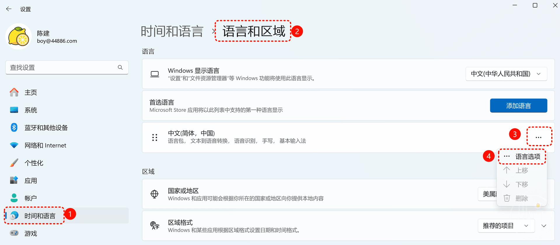 在系统的设置中进入到这个路径:时间和语言-语言和区域-语言后的...-语言选项,就能进入到微软拼音的设置了。