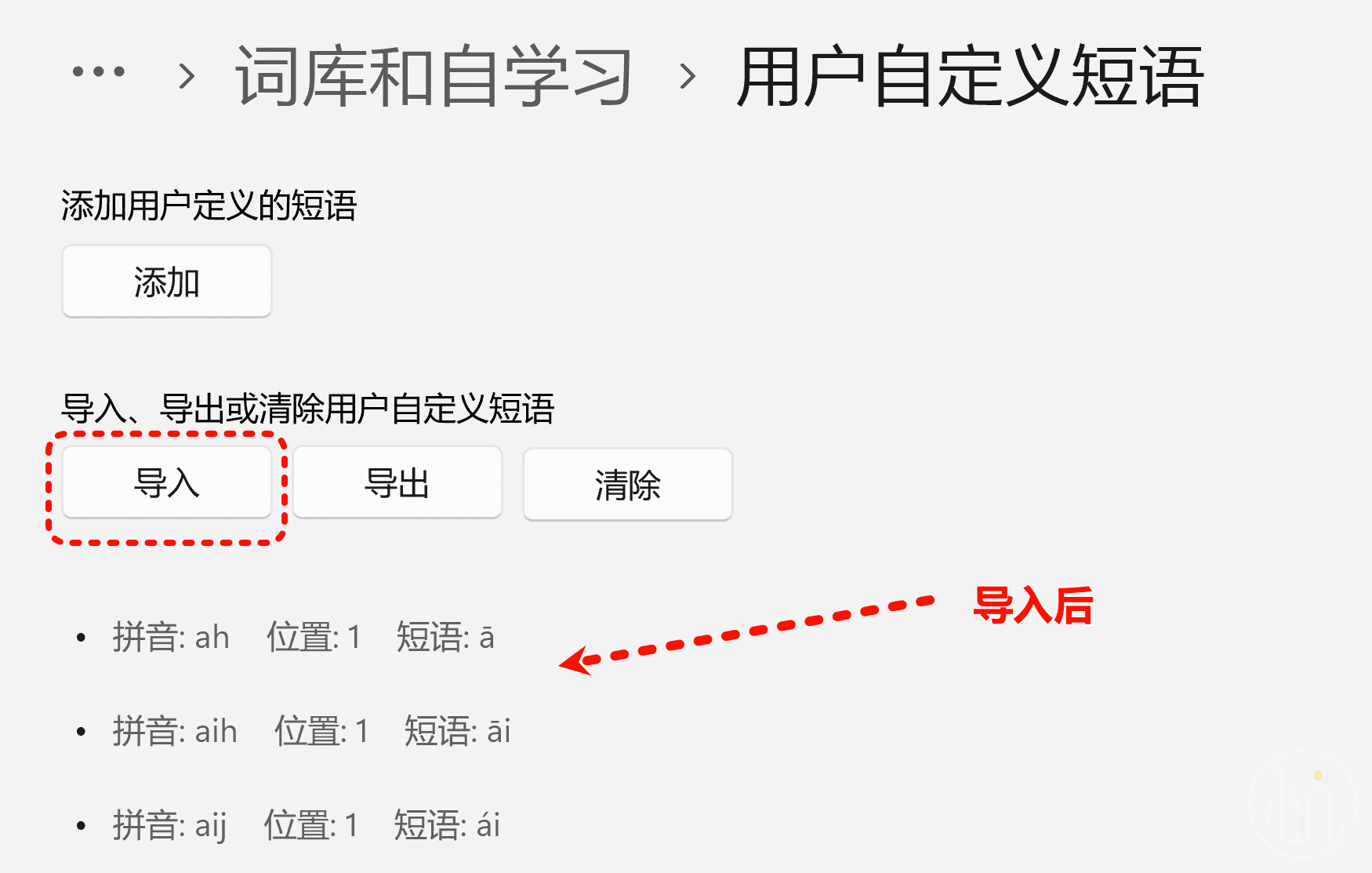 在这儿导入本文最后下载的“汉语拼音_自定义短语_微软拼音.dat”即可,导入后就能看到结果了。
