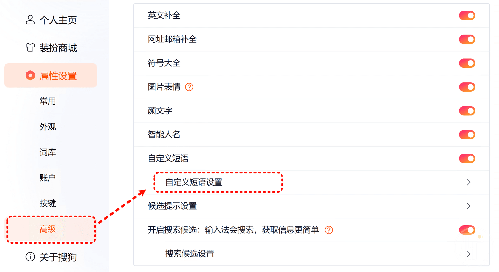 其它输入法和上面我的两种演示类似。但不管什么输入法,不要找“词库”而是找“自定义短语”。