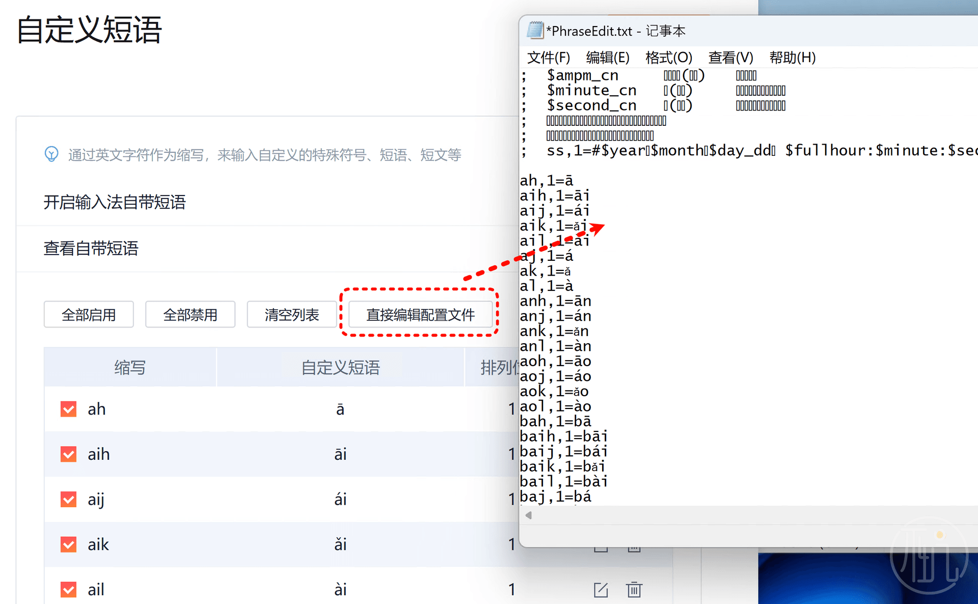 点击界面上的直接编辑配置文件,会弹出一个文本文档,把本文提供给你的汉语拼音\_自定义短语\_搜狗导入.txt全部复制到里面即可,保存即可。