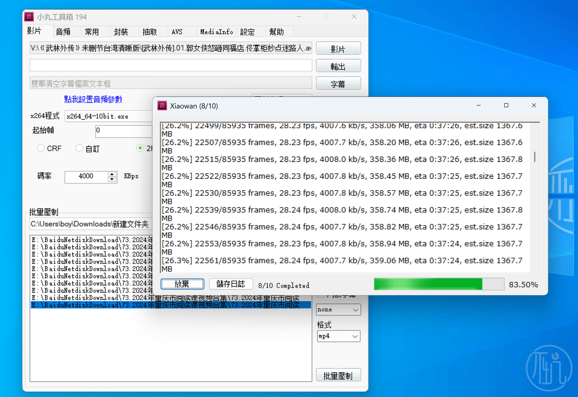 正好,昨天得到了一套课堂实录的视频,但每个视频的体积都太大了(大于10G),太占用存储空间了,我就用小丸工具箱在批量压缩。