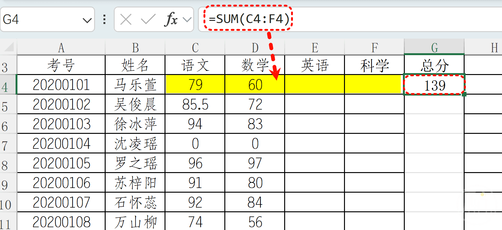 求好第一格子后,双击它右下角的“▄”,即将这一列下面的格子也套用这个公式,求得全部的和。