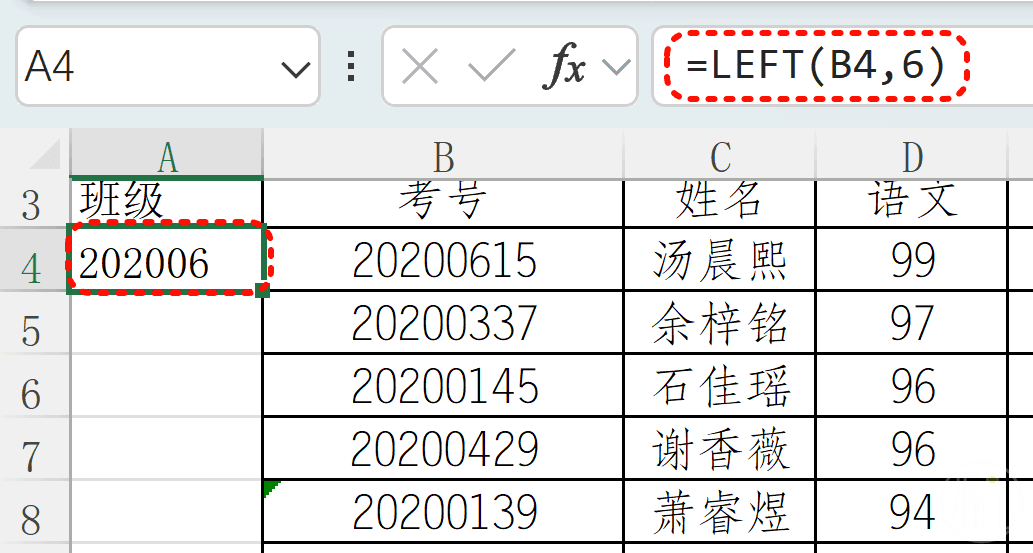 所以,我们要从考号中提取出班级,在前面新加一列,用这两个公式来提取: