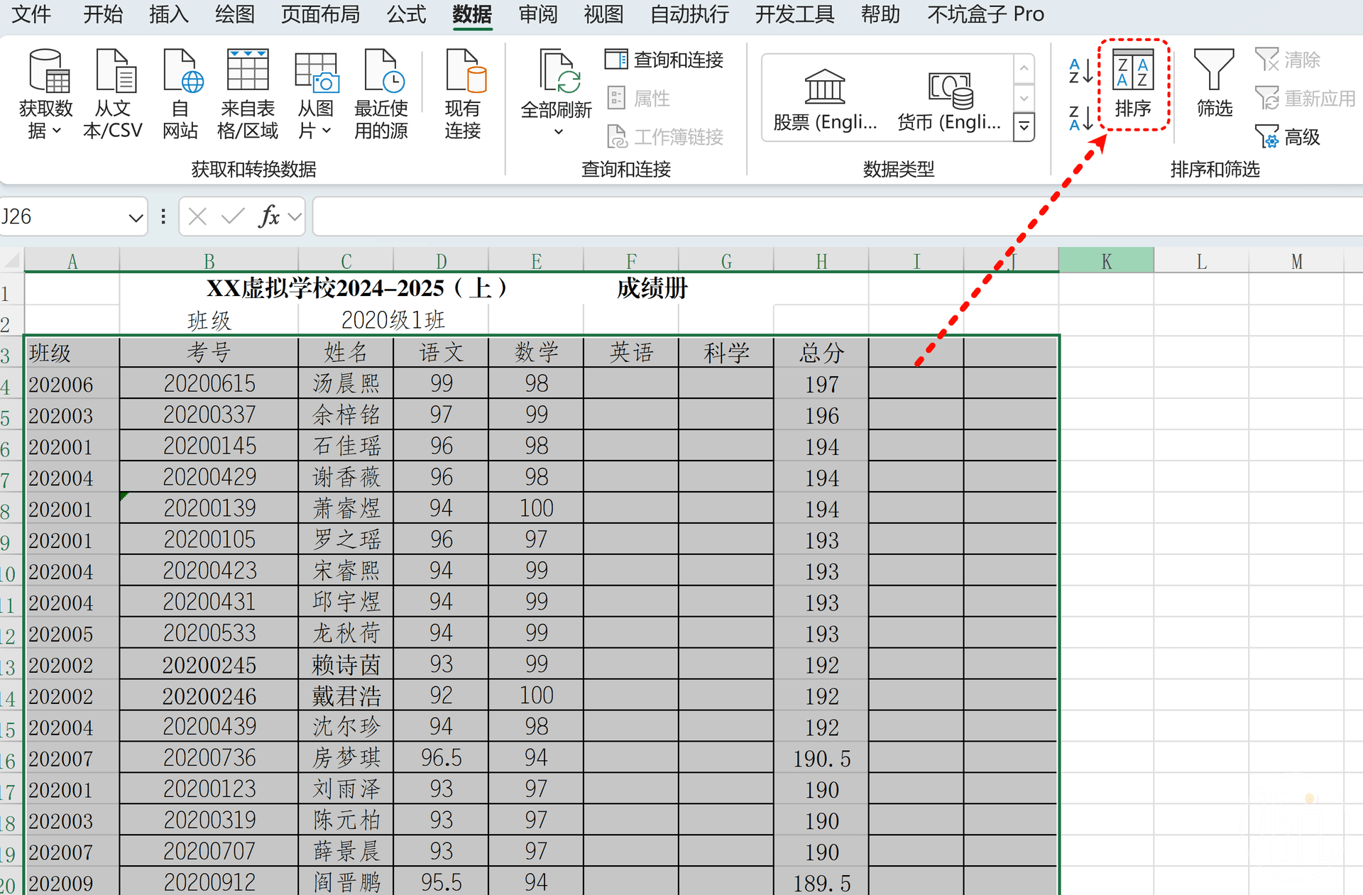合并全部数据→求总分→根据总分进行年级排序→筛选自己班的名单→根据部分进行班级排序