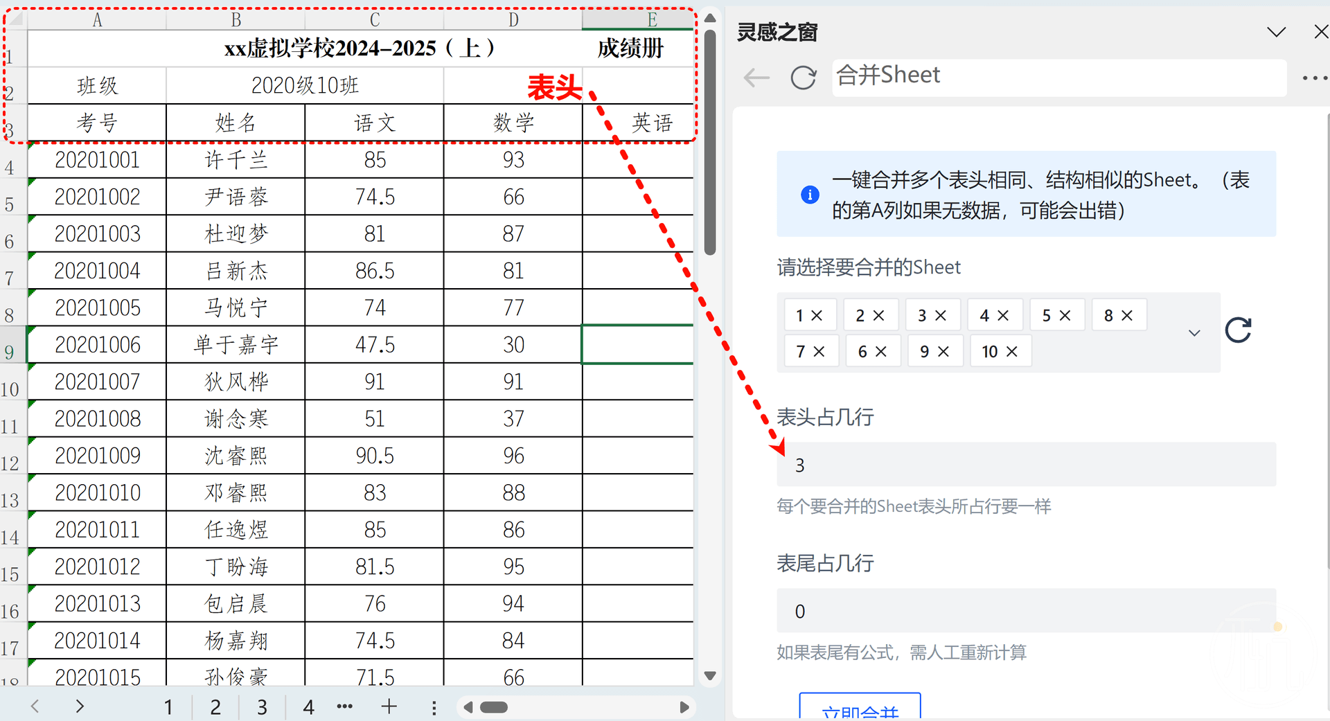 使用不坑盒子的“合并表”功能,可以快速把N个Sheet中的数据合并在一起,并能很好地处理表头。
