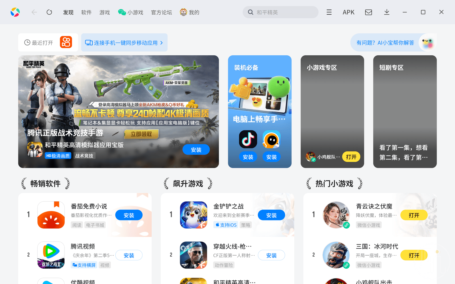 你只需要在电脑上安装腾讯家的应用宝软件,即可一站式运行安卓APP了。