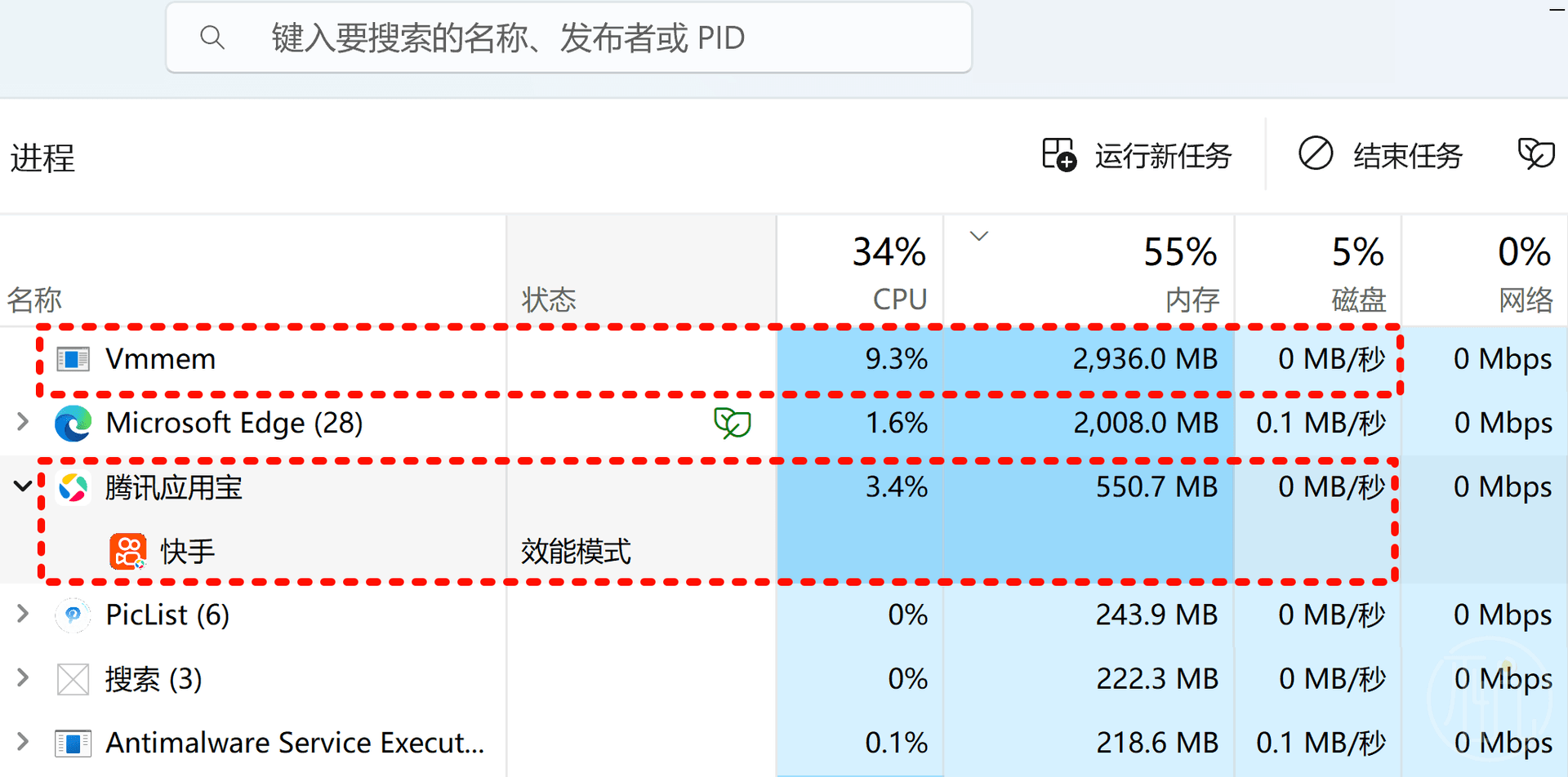 在上面截图中,两个红框之间夹着的Edge浏览器,吃掉的资源也不少了。