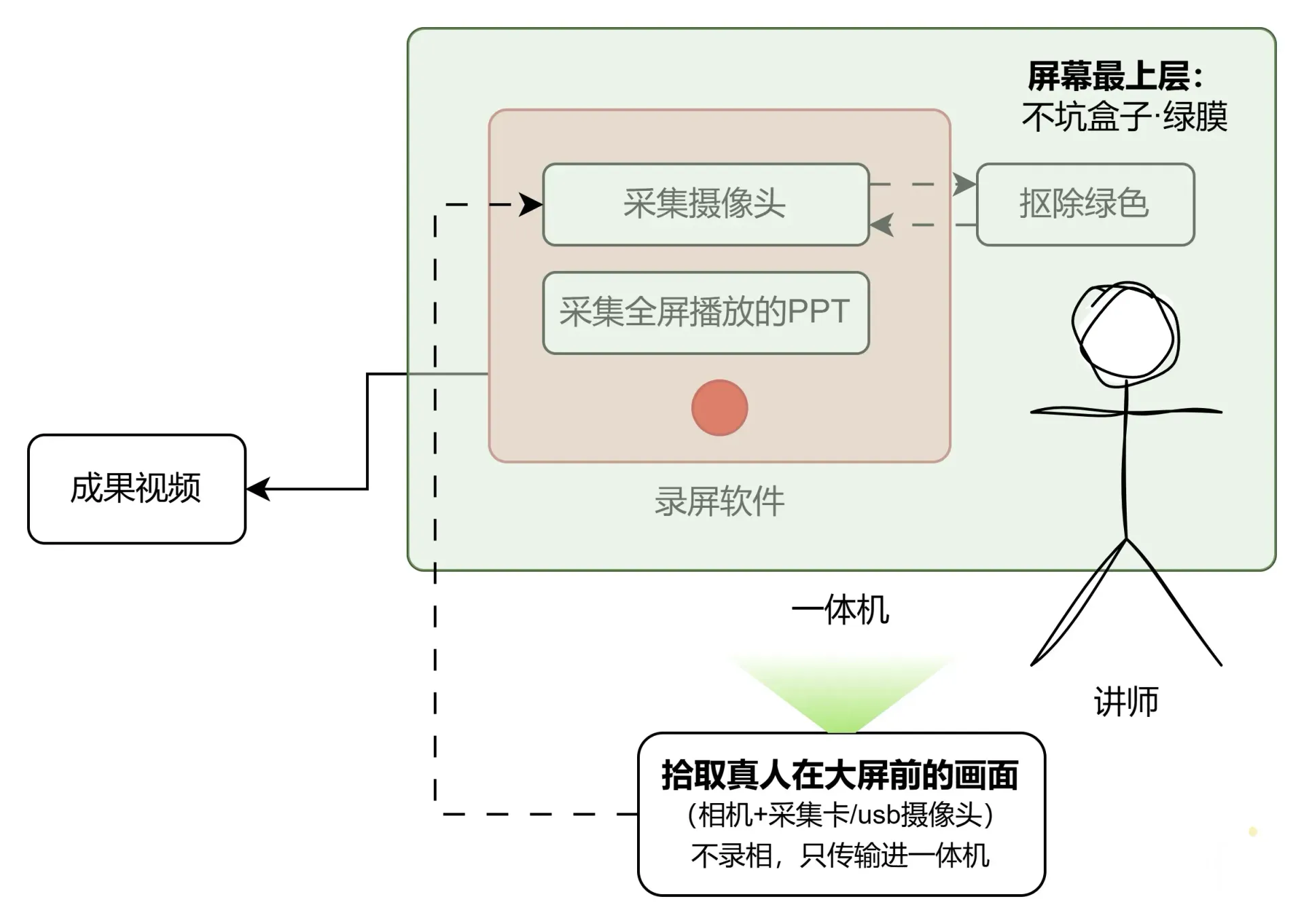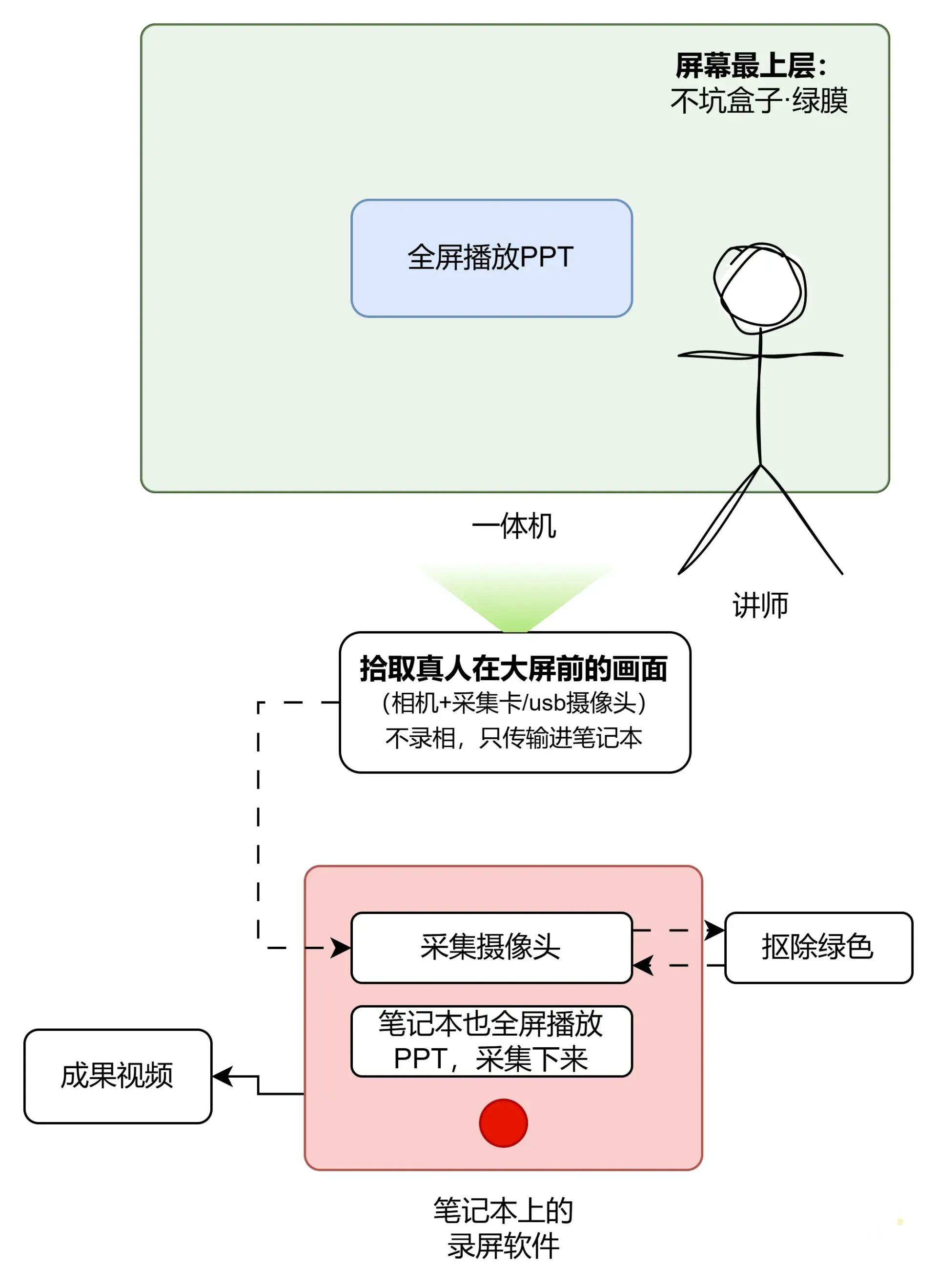 这样做的好处就是,讲课的老师站在大屏前,既能偶尔回头看大屏的内容,又能享受绿幕录课的高清和自由。