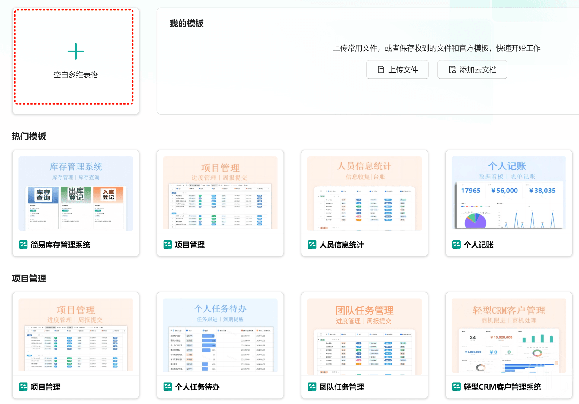 这下方好多别人完善的多维表格来制作各种系统的模板,你如果感兴趣可以使用看看,但我们还是选择“空白多维表格”:
