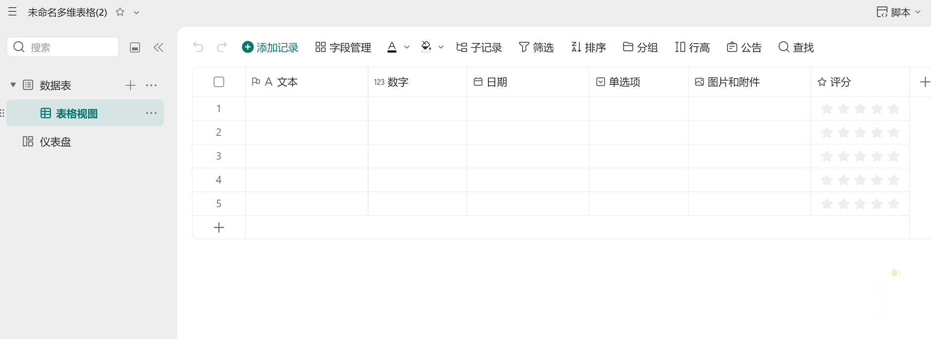 多维表格的核心就是这张数据表,它和Excel不一样,不能像Excel那样像在画布上在随意单元格填数据;这个只能按字段、一行一行添加数据。