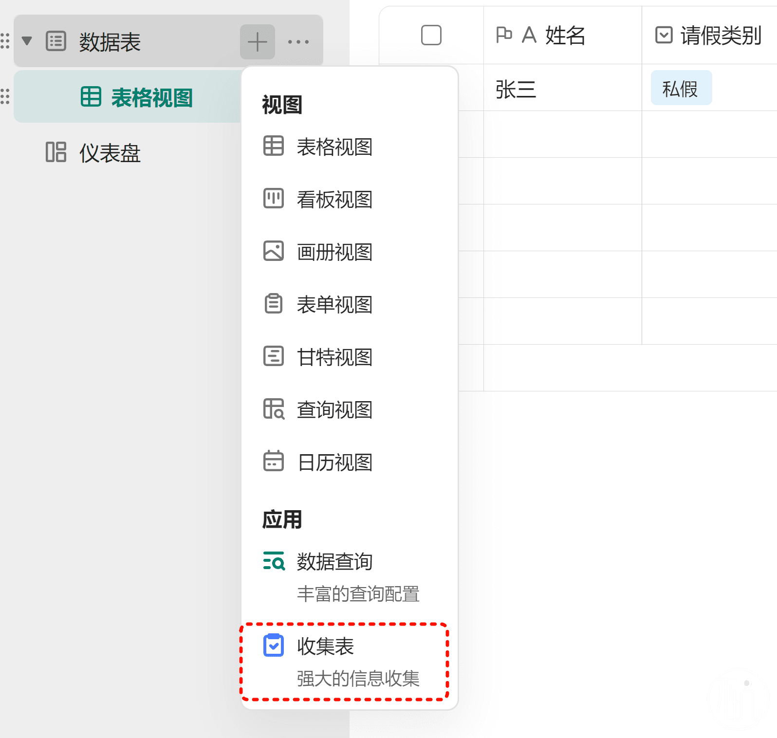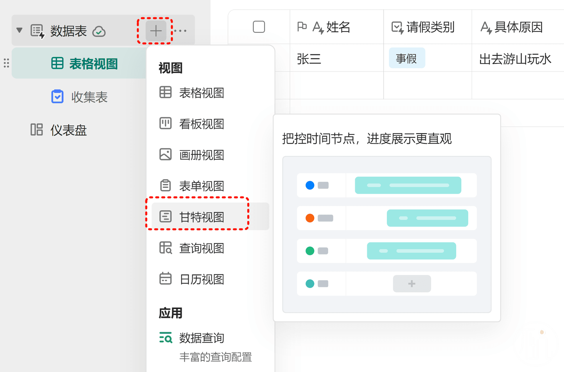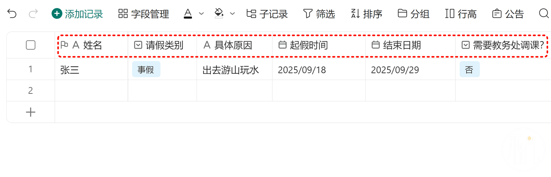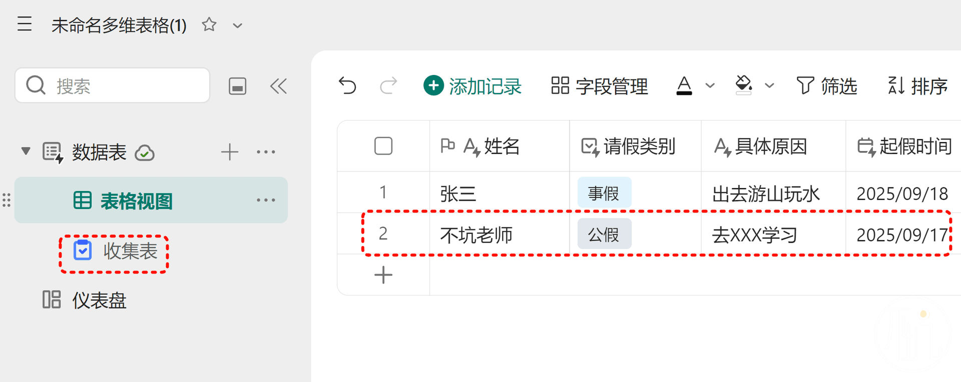 前面的操作,需要领导进入到这个多维表格才能看到请假情况。