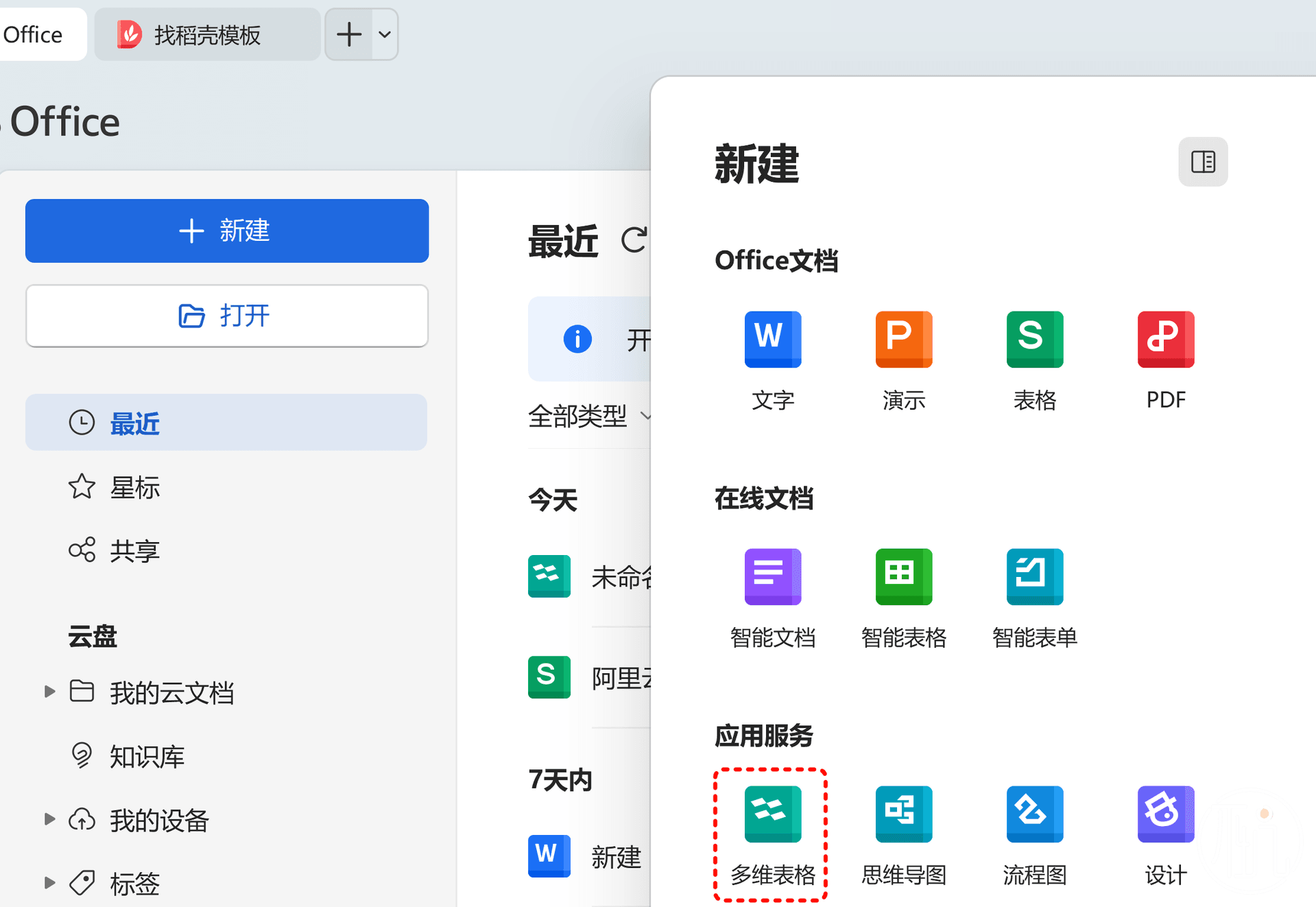 打开WPS,点击新建按钮后,选择“多维表格”: