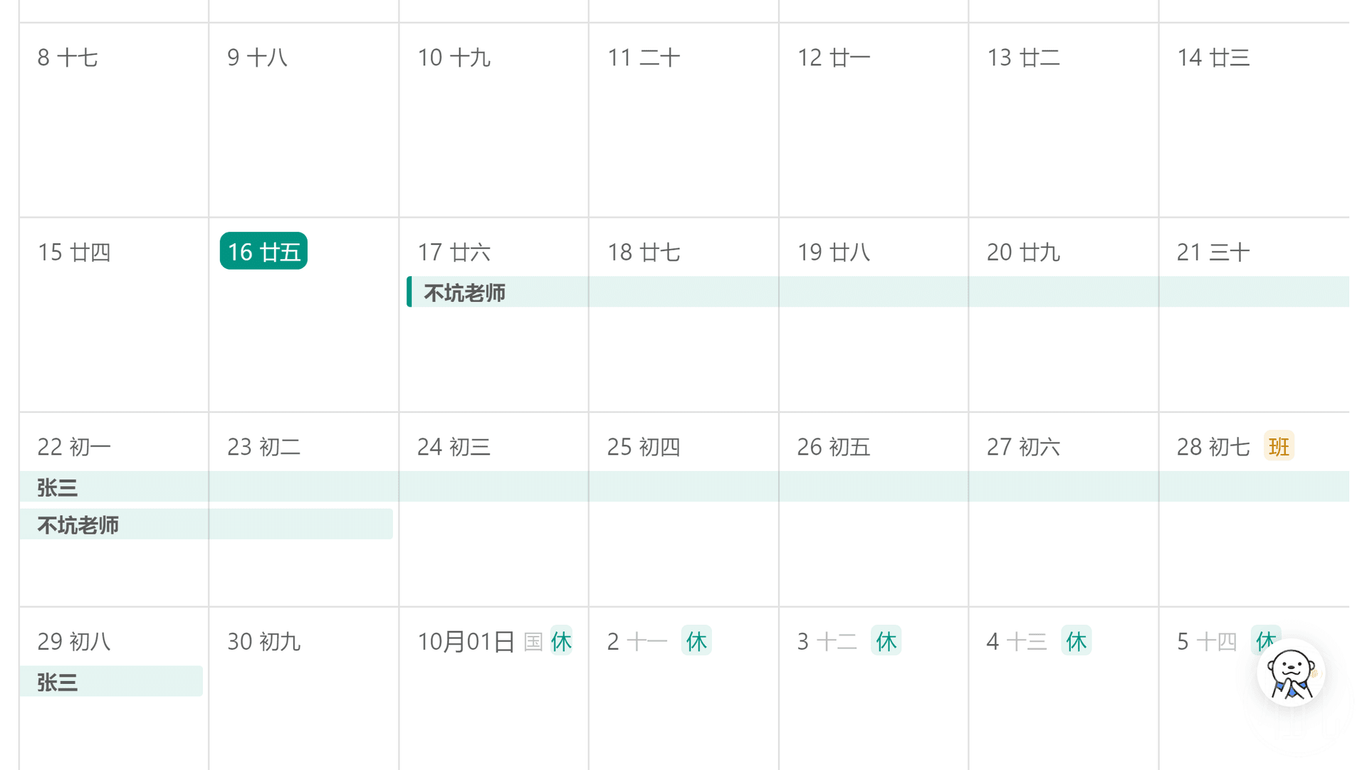 还可以增加一个“日历”视图,除了能直观看到请假情况,还能在上面作批注: