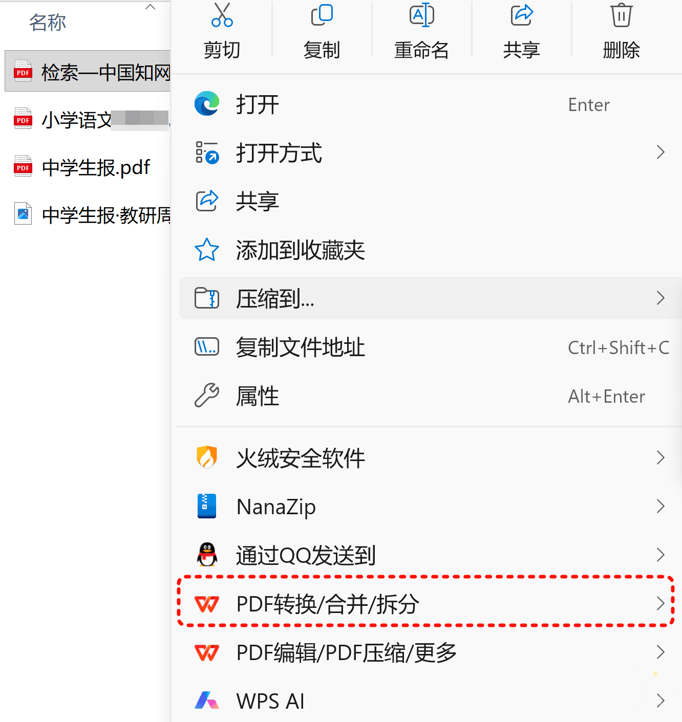 如果你的电脑安装了WPS,那么右键点击这些PDF文档的时候,就能看到“PDF转换/合并/拆分”这个选项,点进去。