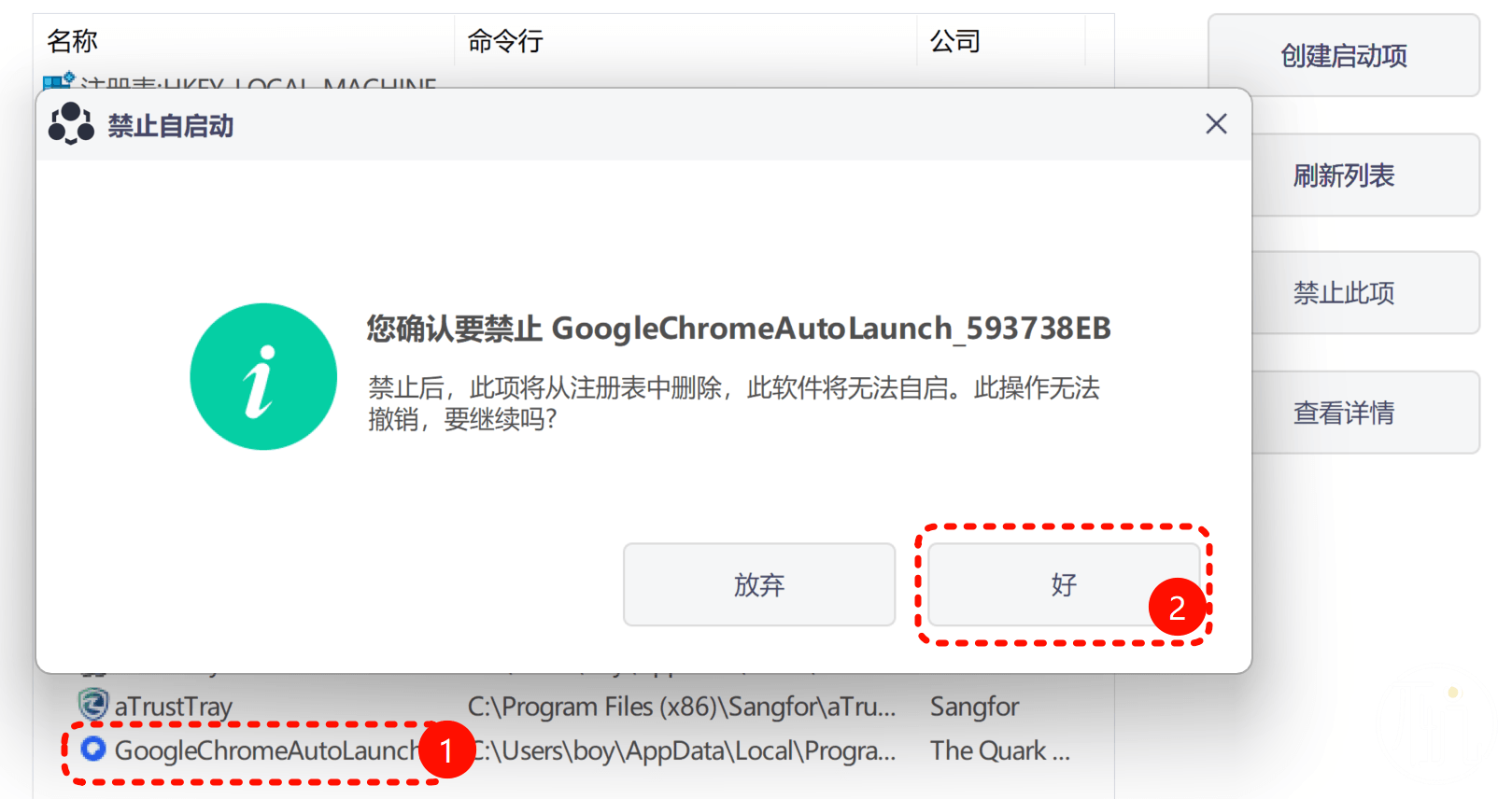 选中不需要开机启动的软件,右键点击,然后点击“好”,把它从开机启动列表中移除。
